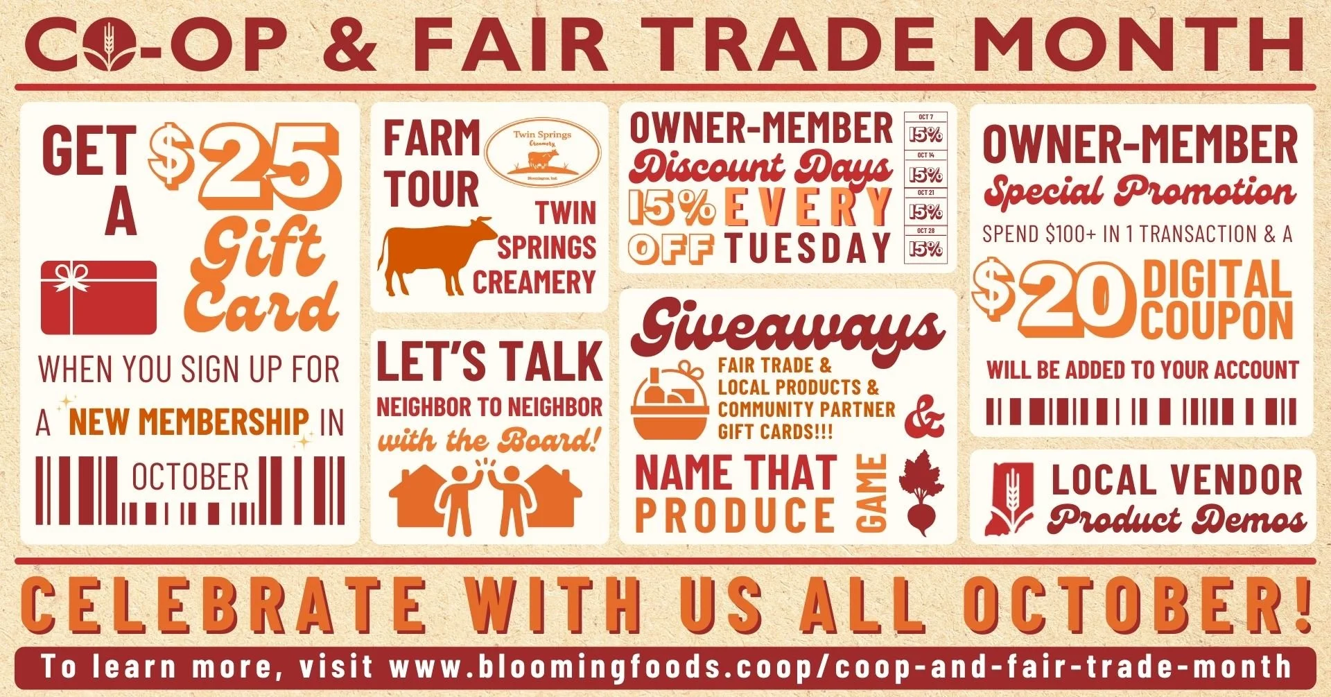 To learn more about Co-op & Fair Trade Month promotions, events, & giveaways throughout October, visit www.bloomingfoods.coop/coop-and-fair-trade-month or click the button below.
