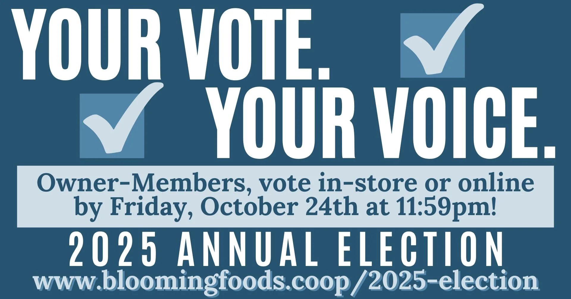You can place your vote in-store with a paper ballot or online at www.bloomingfoods.coop/2025-election.